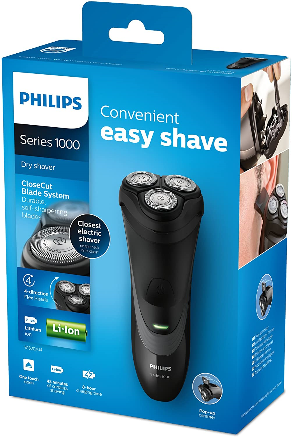 Philips Series 1000 S1520/04 Rasoio Elettrico per Rasatura a Secco con Lame CloseCut, Testina Flex&Float, Rifinitore Integrato, 45 min Autonomia, 8 ore